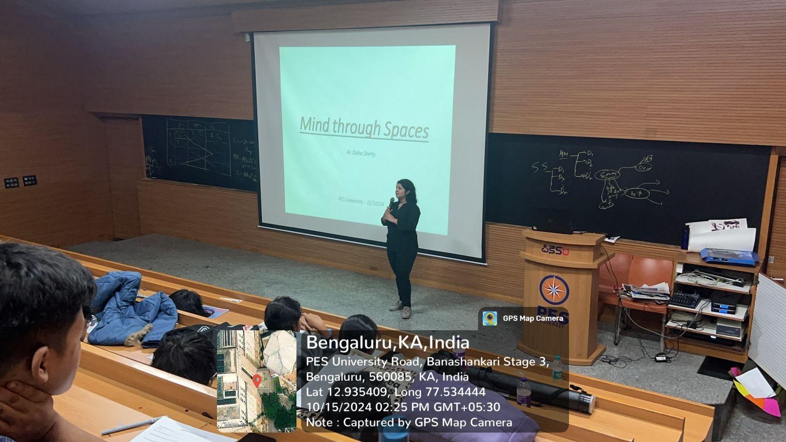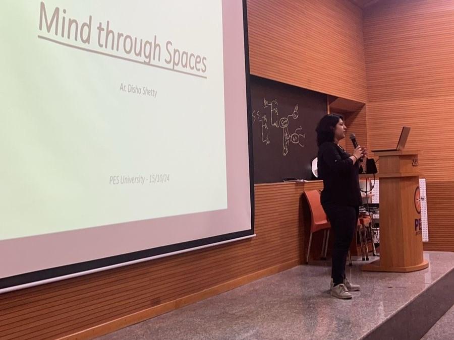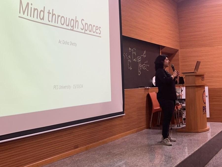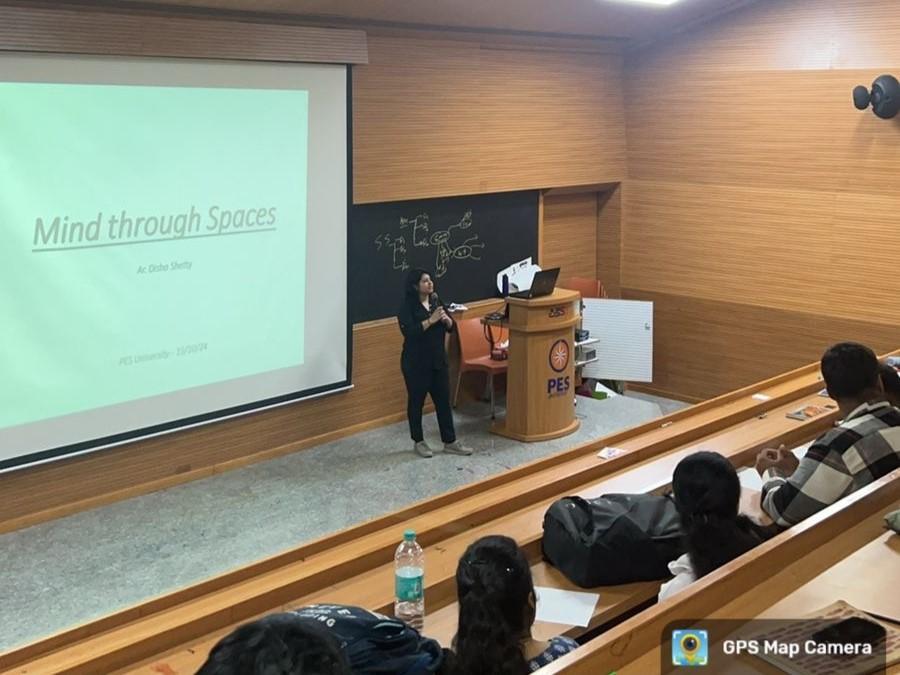 Architect Disha discussed design strategies that prioritize mental well-being, including biophilic design and the creation of inclusive spaces. She emphasized how incorporating natural elements into architecture can reduce stress and enhance overall well-being. The Faculty of Architecture organized the session titled Mind through Space by architect. Disha Shetty, Principal Architect at Design Courtyard at RR campus on October 15, 2024.