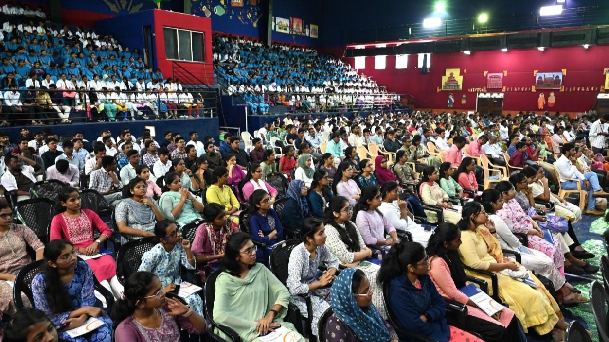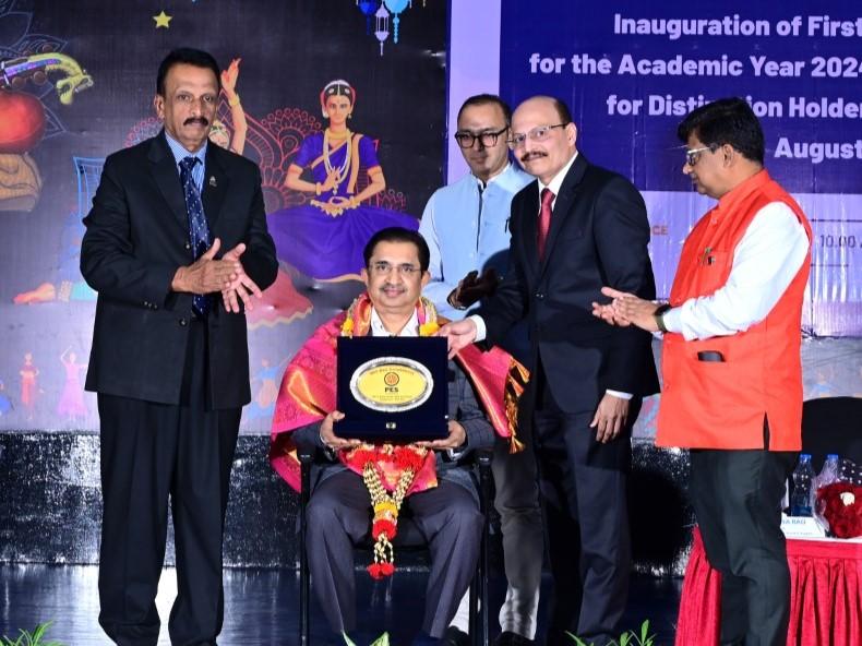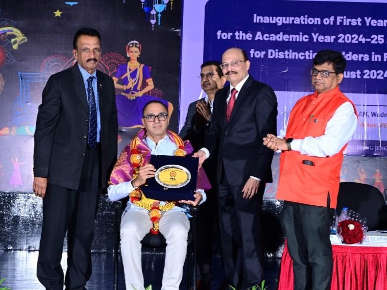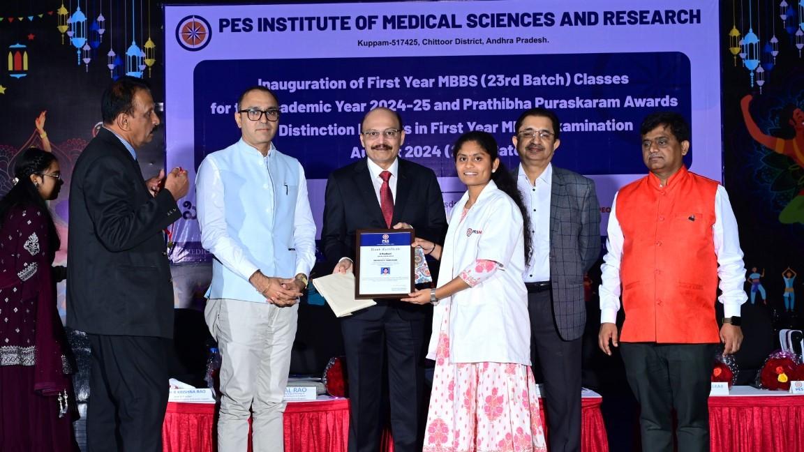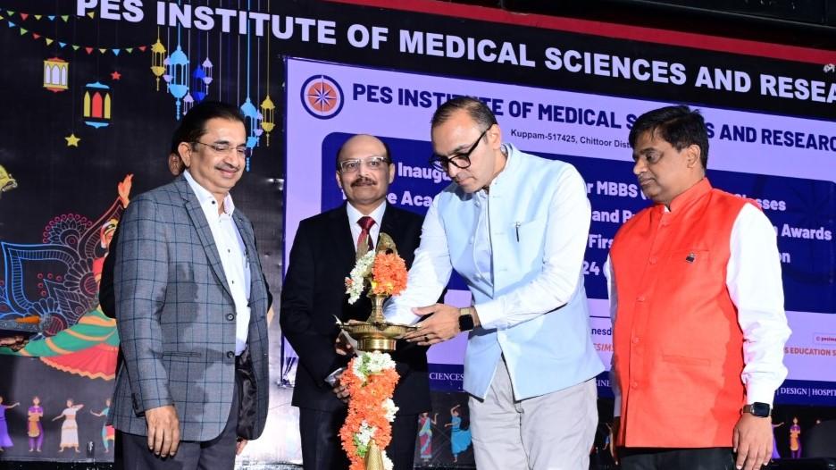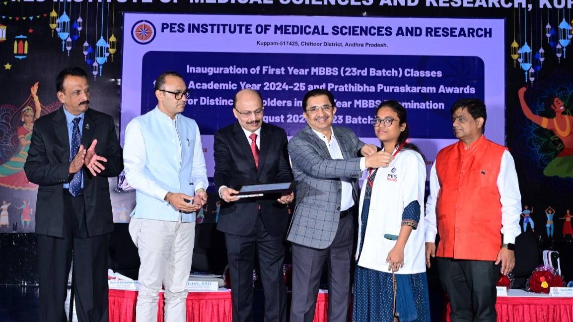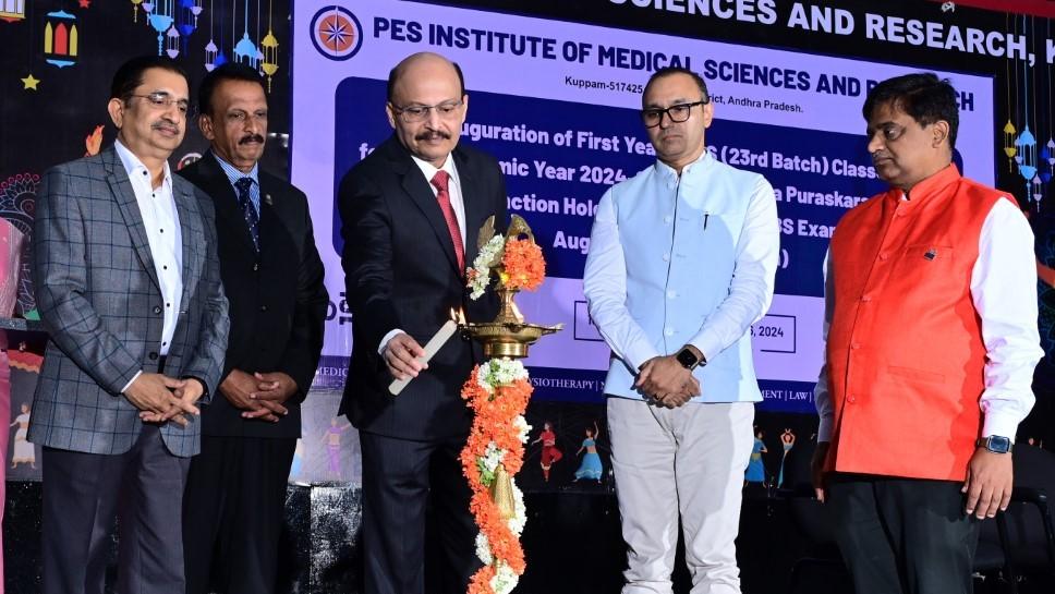 The inauguration ceremony was graced by Chief Guests, Dr. Vishal Rao, Regional Director, Head-Neck Surgical Oncology and Robotic Surgery, HCG, Bangalore, and Dr. B.S. Chandrashekar, Chairman and Managing Director, Cutis Group, Bangalore. Dr. Suresh Krishnamurthy, Medical Director of PESIMSR, Kuppam, presided over the function. The dignitaries on the dais also included Dr. H.R. Krishna Rao, Dean & Principal, PESIMSR, Kuppam, and Dr. Subramanya N K, Medical Superintendent, PESIMSR, Kuppam. Dr. Ryali, Vice Principal (Academics), Dr. Hareesh, Vice Principal (Administration), Dr. Abhirami, Principal of Nursing Programmes, and Dr. Bijish, Principal of Allied Health Sciences and Physiotherapy, all Heads of Departments, faculty members, newly admitted students, and their parents, attended the programme. Dr. H.R. Krishna Rao delivered the welcome address, expressing his delight in welcoming the newly admitted students and their parents to the PES family. Dr. Ryali introduced the vision of PESIMSR and highlighted the facilities provided to the students. Dr. B.S. Chandrashekar emphasized the significance of medical education and Dr. Vishal Rao spoke on the evolving role of doctors, particularly in the context of pre- and post-COVID challenges. Dr. Suresh Krishnamurthy guided the students on effective time management and the importance of the five "P' Mantras Passion, Plan of Action, Perseverance, Personal Health, and Physical Health. As part of the ceremony, the Prathibha Puraskaram awards and medals were presented to the students of the 2023-24 batch who secured distinction in the university examinations. The event concluded with a vote of thanks by Dr. Subramanya N K, Medical Superintendent, PESIMSR, Kuppam. The inauguration ceremony of the 23rd Batch of MBBS for the academic year 2024-25 at PES Institute of Medical Sciences and Research was held on October 16, 2024, at the Kuppam campus.