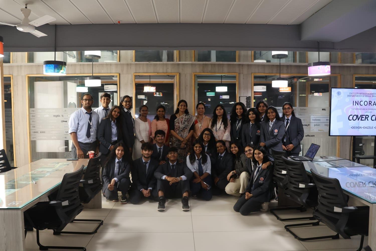 Communication based on the power of storytelling through visuals, capturing the essence of creativity in real-time and collaboration from planning to execution play a key role in marketing success. This structure simulated the journey of publication, from initial concept to final presentation, offering participants hands-on experience in multiple areas of the publishing industry. Faculty of Management and Commerce, Department of BBA and BBA (Business Analytics) in collaboration with Incorates (Literature and Communication Club) organized CoverCraze, a studython on October 23, 2024 at RR campus.