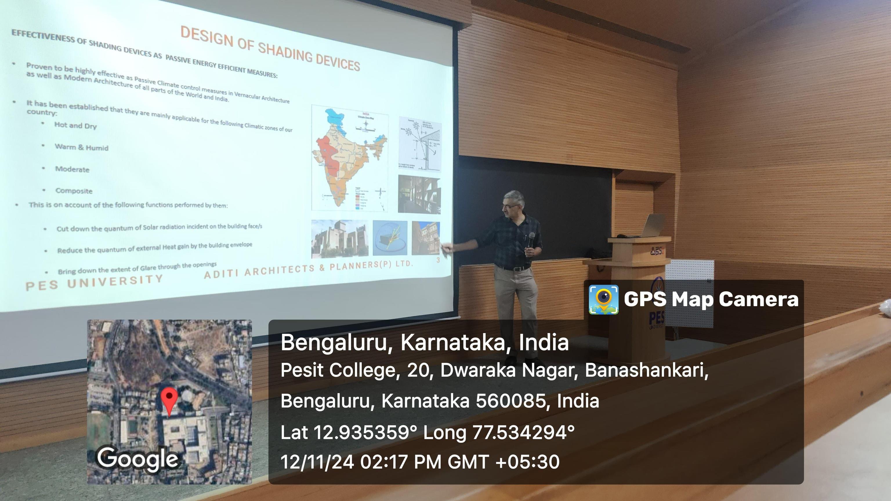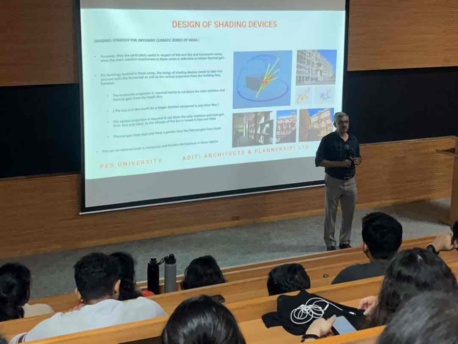 Shading devices play a vital role in energy efficiency, occupant comfort, and building aesthetics. Architect Rajesh Malik discussed factors of material selection, building orientation, and climate considerations that influence shading design. Through practical examples, he highlighted the impact of shading on sustainability and energy use and valuable insights about shading strategies in climate-responsive architecture. The Department of Architecture hosted the talk on The Design of Shading Devices by Architect Rajesh Malik on November 12, 2024 at RR campus.