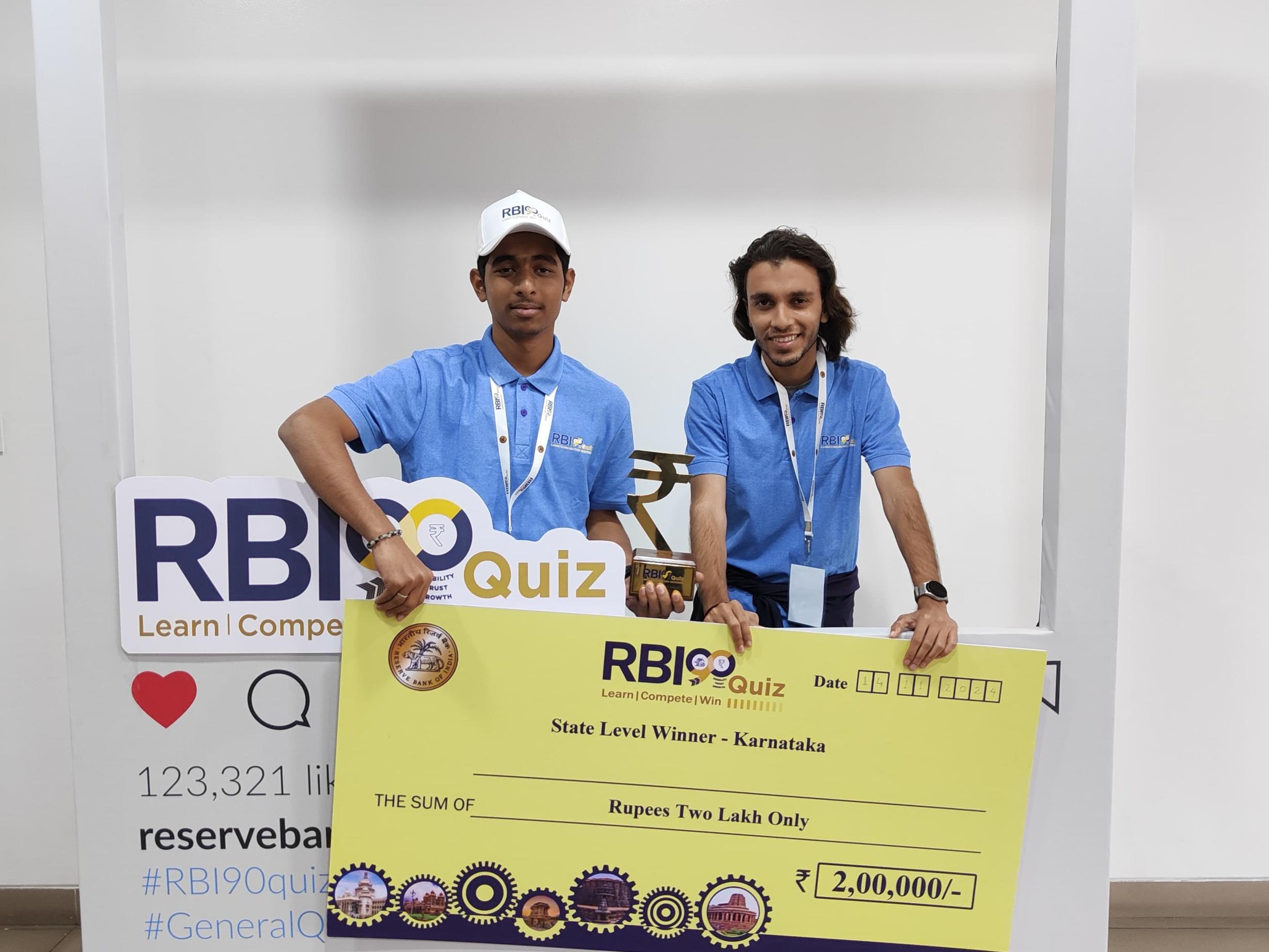 D Bhargava Rama Sarma and Divyansh Sharma won the Karnataka State round of the RBI90 Quiz, hosted by the Reserve Bank of India and advanced to the zonal round. Competing against over 20,000 teams in the initial online round, they showcased exceptional knowledge and determination to qualify among the top 90 teams for the offline state-level competition. The offline quiz comprised two rounds: an initial written round with 30 questions spanning history, business, sports, music, and more, followed by a stage round for the top six teams, covering five sections: India, World, Business, Music and Literature, and Finance and RBI. Bhargava and Divyansh of PESU EC campus were awarded a Rupees two lakh cash prize.