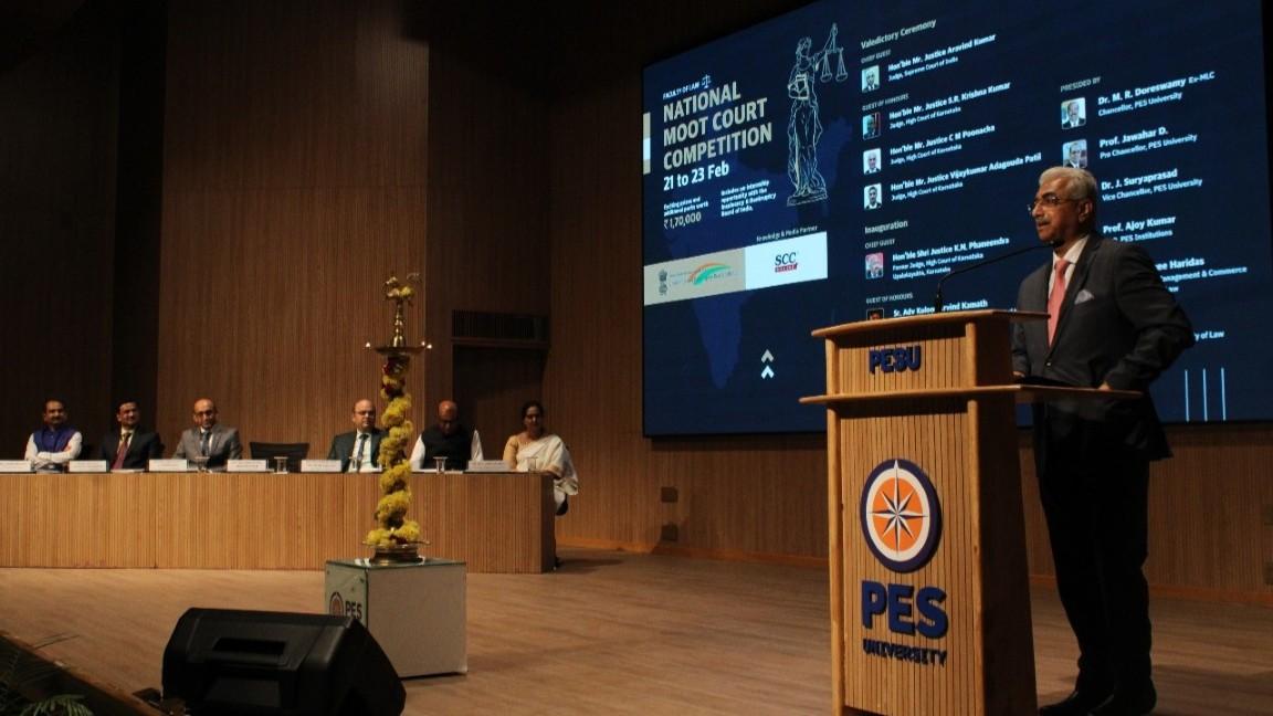 The moot court competition witnessed the participation of budding legal minds from across the country. The grand finale of the competition was judged by Justice S. R. Krishnakumar, Justice C. M. Poonacha and Justice Vijaykumar Patil, esteemed sitting judges of the High Court of Karnataka. The event was inaugurated by Justice K. N. Phaneendra, the Upalokayukta of the Government of Karnataka, in the presence of Mr. Aravind Kamath, Additional Solicitor General of India to the High Court of Karnataka, and Mr. Prashanth V. G., Partner at J. Sagar Associates. Additional Advocate Generals of the High Court of Karnataka, designated senior advocates, and partners from various law firms across Bangalore attended the program. The valedictory ceremony was graced by Justice Aravind Kumar, Judge of the Supreme Court of India, as the Chief Guest. The PES University National Moot Court Competition in collaboration with the Insolvency and Bankruptcy Board of India was held on February 21-23, 2025 at RR campus.