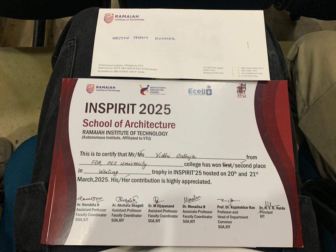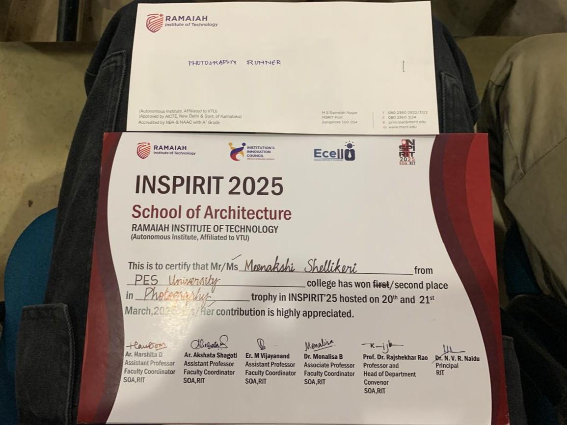 Meenakshi Shelikere won first prize in Photography competition for her keen eye for detail and artistic vision and ability to capture compelling visuals that tell a story. Vidhi Bhatia secured second place in the writing competition for her ability to express ideas effectively and demonstrating excellence in written communication. Inspirit 2025 RITSOA, the Annual Architectural Design and Cultural Fest hosted by The School of Architecture, MSRIT was held at Bangalore on March 20-21, 2025.