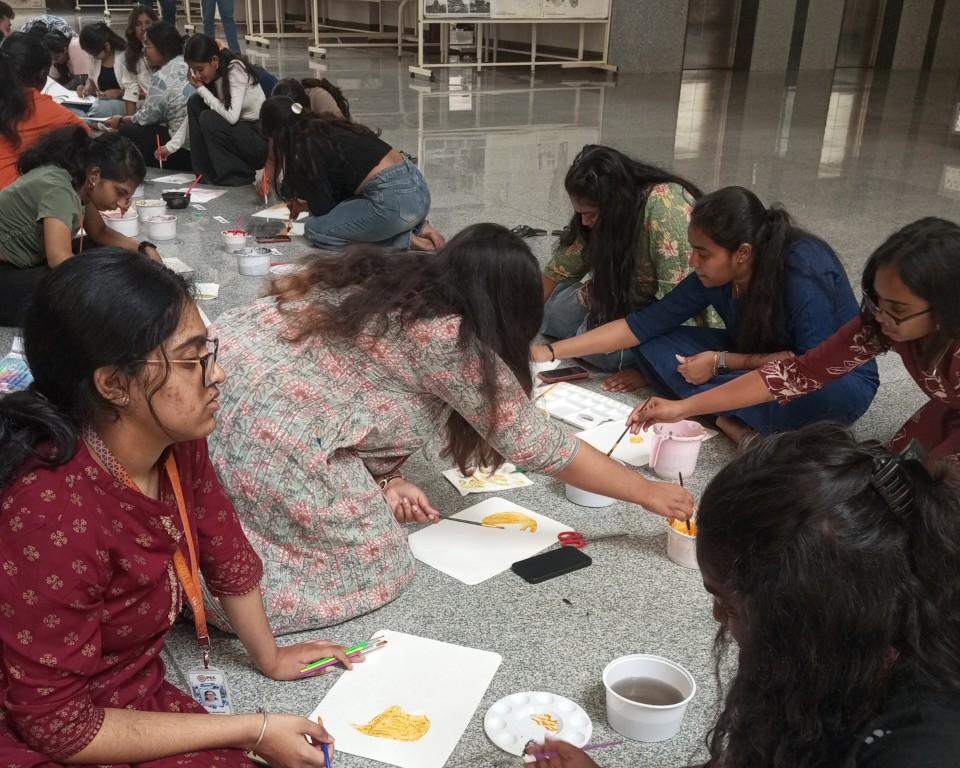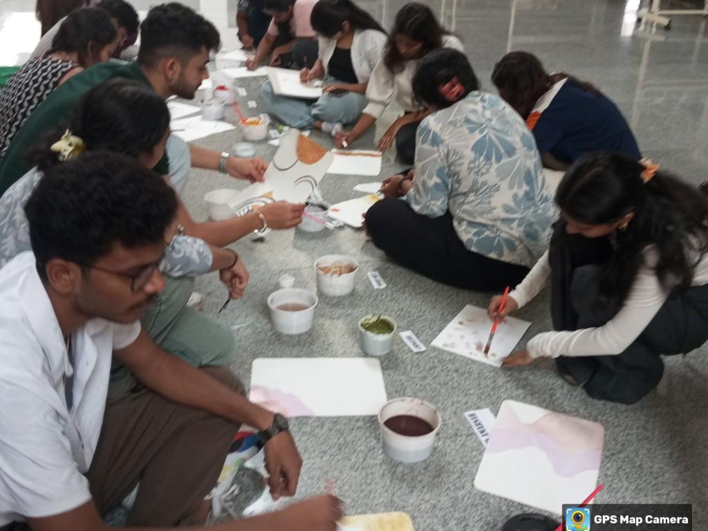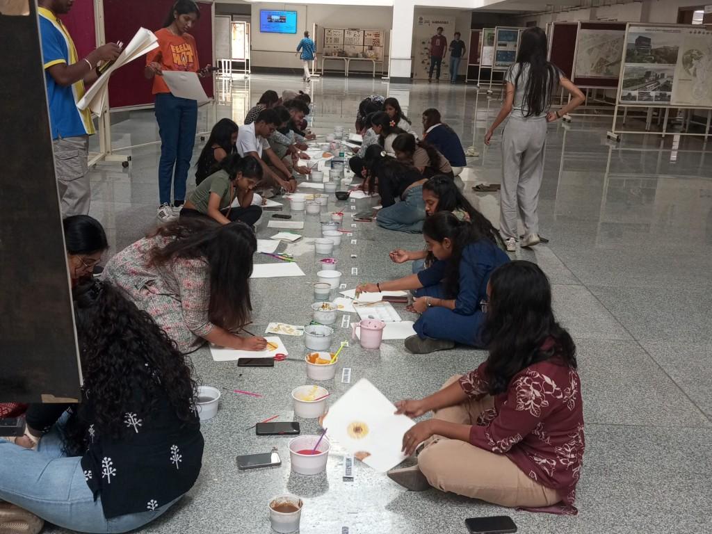 The session aimed to explore the use of natural resources for creating sustainable and eco-friendly colors, which can be used in architecture, art and design. The workshop introduced students to a diverse range of natural color sources that are traditionally used for dyeing and painting. The colors, extracted from plants, fruits, spices, and minerals, were demonstrated through hands-on activities where students could create pigments and understand their origins and applications. Some of the natural color sources explored during the session included: sandalwood, saffron, tamarind, turmeric, lime and lemon, beetroot, pomegranate, dragon fruit, hibiscus, spinach and coriander, henna, coffee and tea decoction, jamun, marigold and rose, red cabbage, pea flower, soap nut, chilli & mango, watermelon, cocoa powder and clay variants. Boho painting activity, a workshop on natural color pigments was conducted by faculty of Architecture on March 27, 2025 at RR campus.
