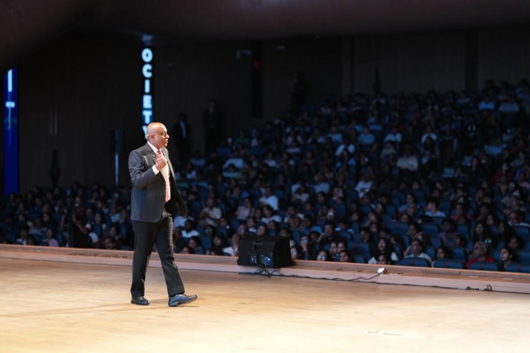 Prof. Jawahar Doreswamy stressed the need for effective time management and habit formation, advocating for early rising, regular physical activity, and balanced technology use. He highlighted PES University's advanced AI-driven academic infrastructure and urged students to actively engage in library research, CXO talks, hackathons, and recreation as part of holistic development.