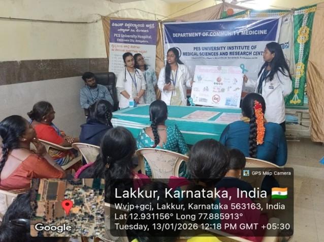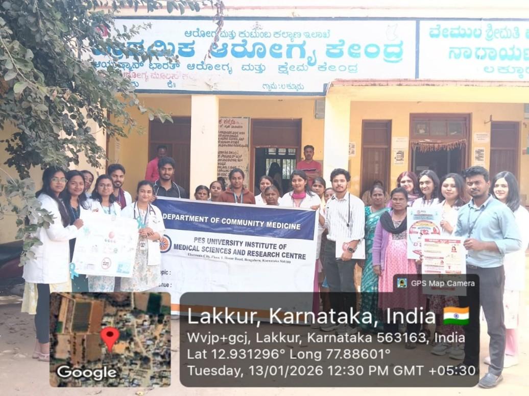 On 13 January 2026, the Rural Health Training Centre of the Department of Community Medicine, PES University Institute of Medical Sciences and Research (PESU‑IMSR), organized a meaningful Cervical Cancer Awareness Programme at PHC Lakkur. This community initiative focused on educating women about cervical cancer—one of the most preventable yet widespread cancers affecting women worldwide.