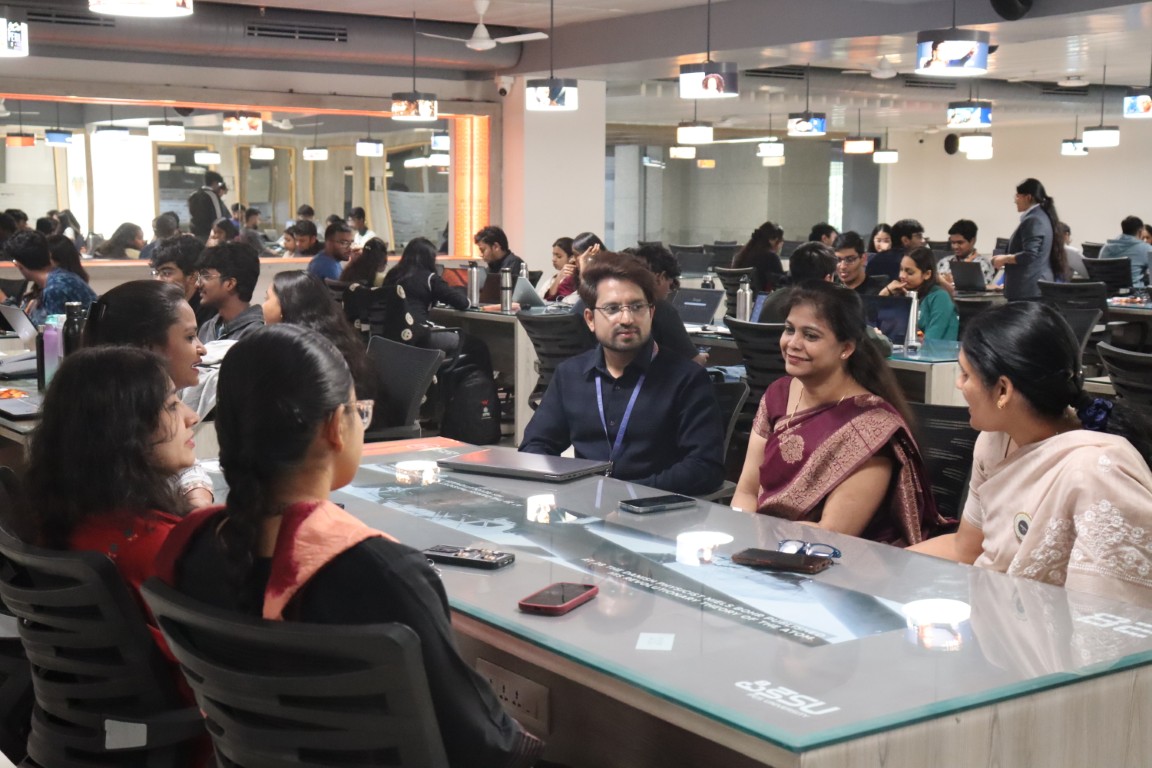 Participants then moved through three structured rounds—Problem Analysis, Impact Catalyst, and Solution Synthesis—designed to push innovative and feasible thinking. Throughout the night, faculty mentors and alumni reviewers guided teams across multiple rooms, helping them refine their ideas using data-driven insights, market research, and feasibility frameworks. A unique simulation activity recreated the Dabbawala coding and delivery system, giving students hands-on exposure to coordination and logistical precision.