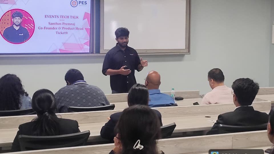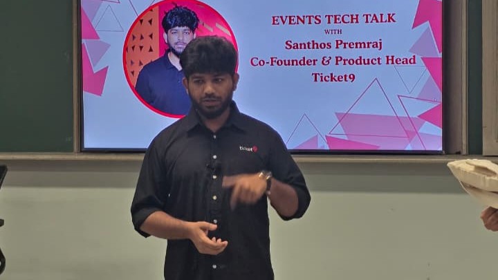 The talk was delivered by Mr. Santos Premraj, Co‑Founder and Product Head of Ticket9, a leading platform in the event technology space. The session began with an introduction highlighting his entrepreneurial journey and his contributions to modern event management solutions.