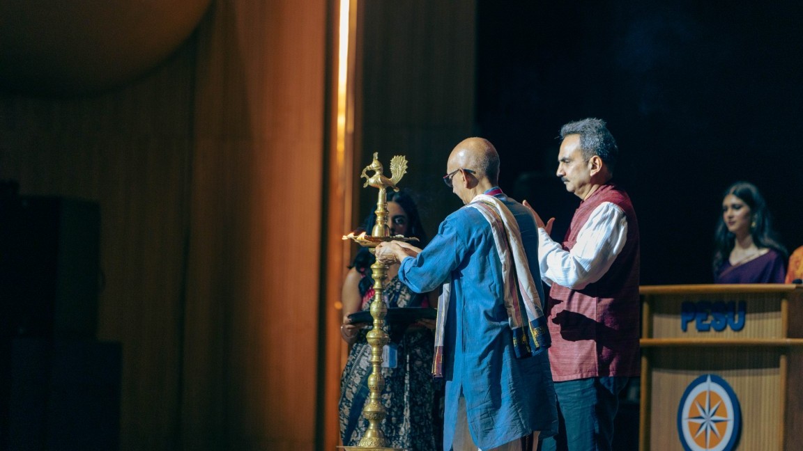 The evening commenced on a serene note with an invocation song by Rithya, a 4th‑semester student from the Department of Performing Arts. Her soulful rendition of “Gajavadana Beduvenu” captivated the audience and set a graceful tone for the night. This was followed by the traditional lighting of the ceremonial lamp, formally inaugurating CulNite ’26. The ceremony was led by Dr. J. Suryaprasad, Vice‑Chancellor of PES University, who also served as the Chief Guest, along with Dr. V. Krishna, Dean of Student Affairs.